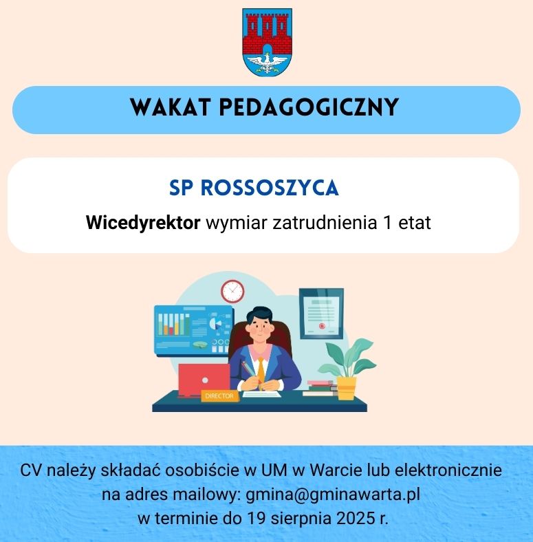 CV należy składać osobiście w Urzędzie Miejskim w Warcie lub elektronicznie na adres mailowy gmina@gminawarta.pl w terminie do 19 sierpnia 2025 r.