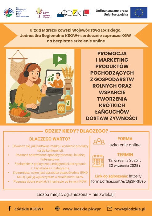 Urząd Marszałkowski Województwa Łódzkiego, Jednostka Regionalna KSOW+, organizuje bezpłatne szkolenie online dla Kół Gospodyń Wiejskich z terenu naszego województwa.