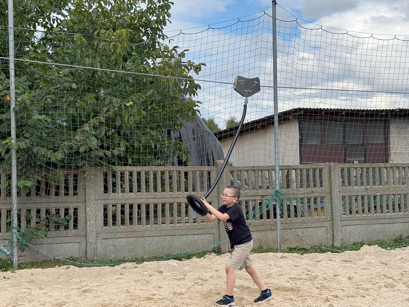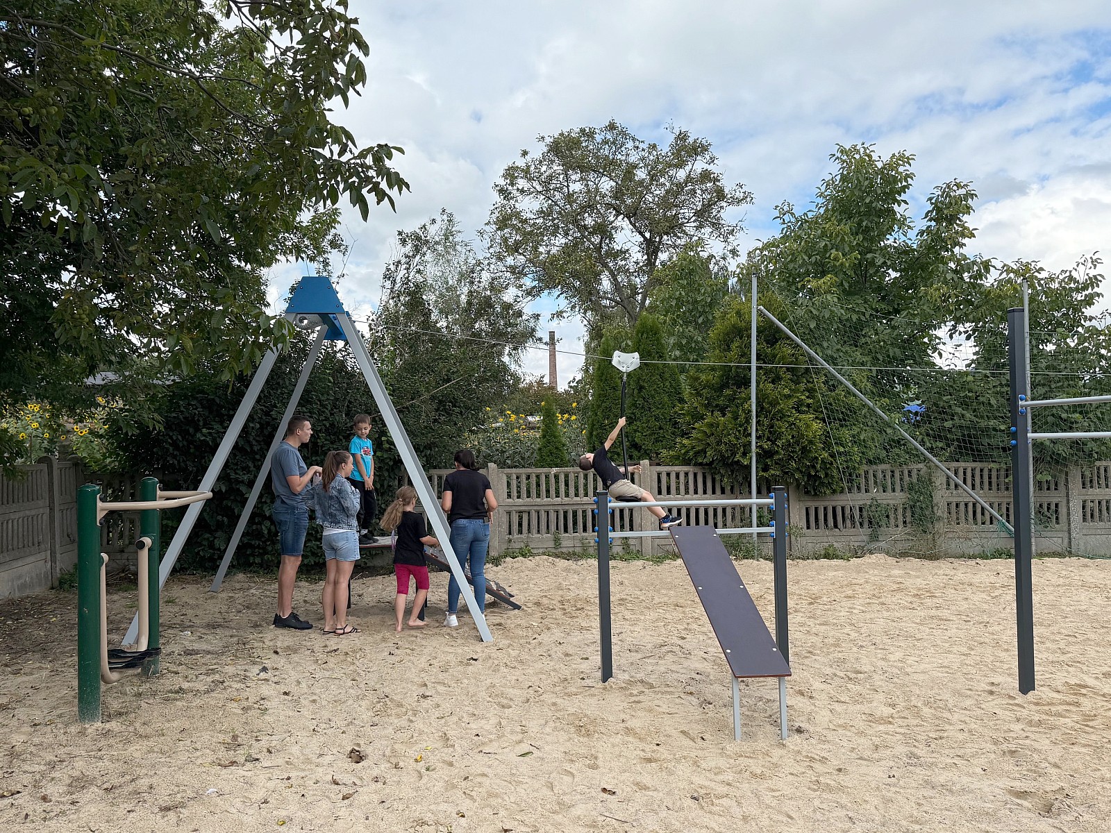 - Tyrolka – zjazd linowy - konstrukcja wykonana z profili stalowych 10 x 10 cm, ocynkowanych ogniowo, malowanych proszkowo, mechanizm jezdny: lina i trolej wykonane ze stali ocynkowanej, podest startowy wykonany ze sklejki, antypoślizgowa wodoodpornej, pozostałe elementy wykonane ze stali ocynkowanej, malowanej proszkowo,