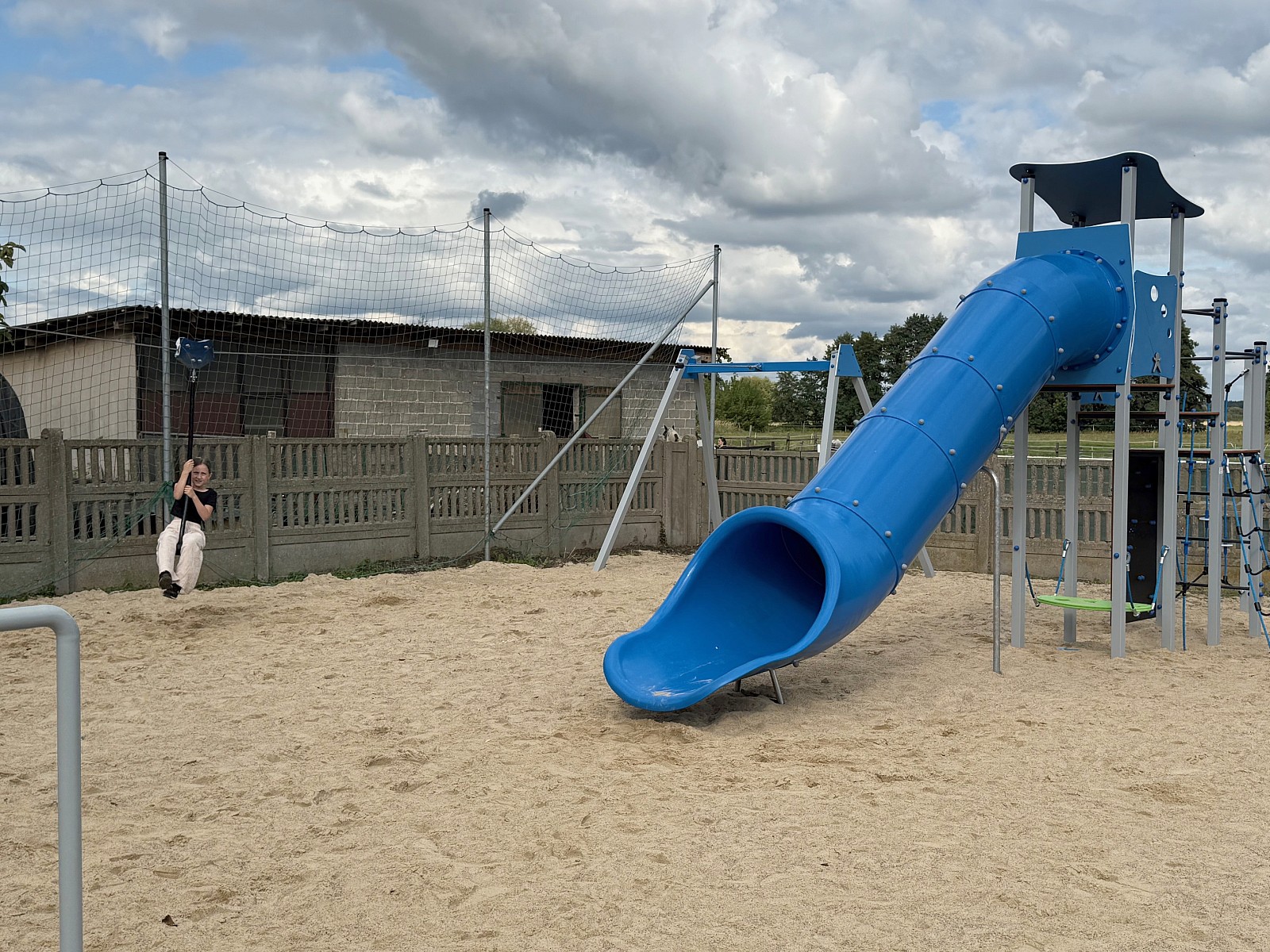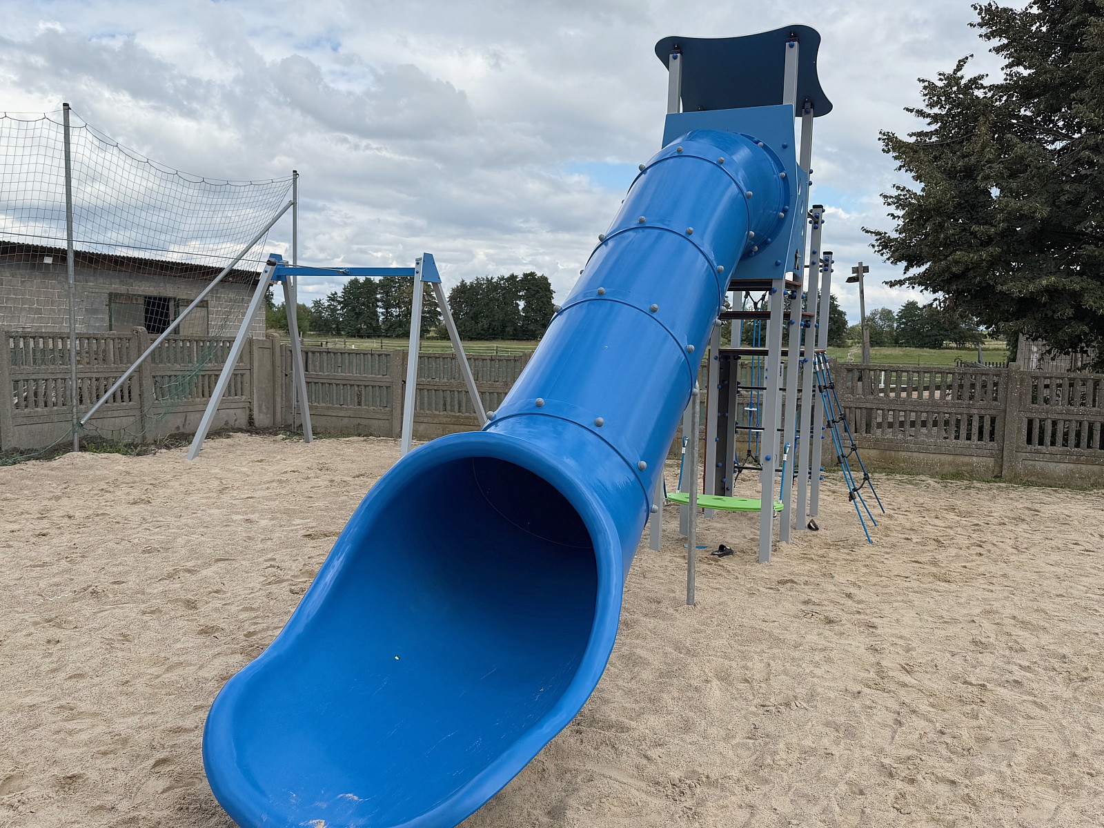 - Zestaw zabawowy dla dzieci zawierający m.in. trzy elementy zjeżdżalnię, przelotnię linową, pionową z dyskami, ścianka wspinaczkowa - konstrukcja wykonana z profili stalowych 7 x 7 cm, ocynkowanych, malowanych proszkowo, ślizg zjeżdżalni wykonany z tworzywa LLDPE, drążki, przewężenia wykonane ze stali ocynkowanej, malowanej proszkowo, bariery, dach wykonane z kolorowego tworzywa HDPE, podesty, ścianka wspinaczkowa wykonane z wodoodpornej sklejki antypoślizgowej, liny przeplotni wykonane z tworzywa PP fi 16 mm na rdzeniu stalowym, śruby i nakrętki ocynkowane,