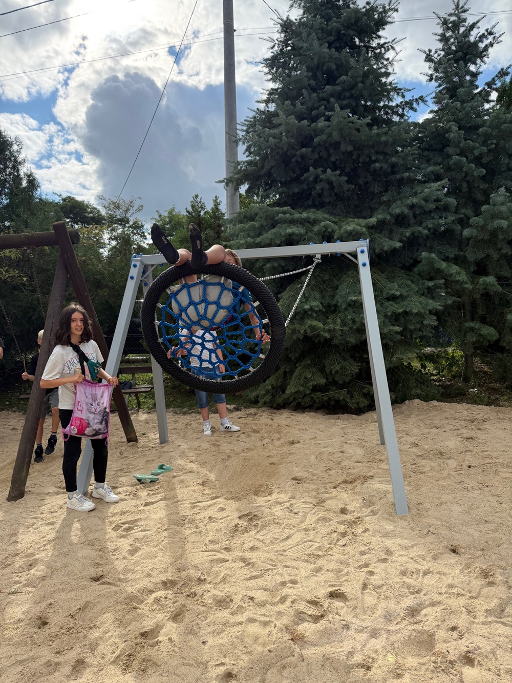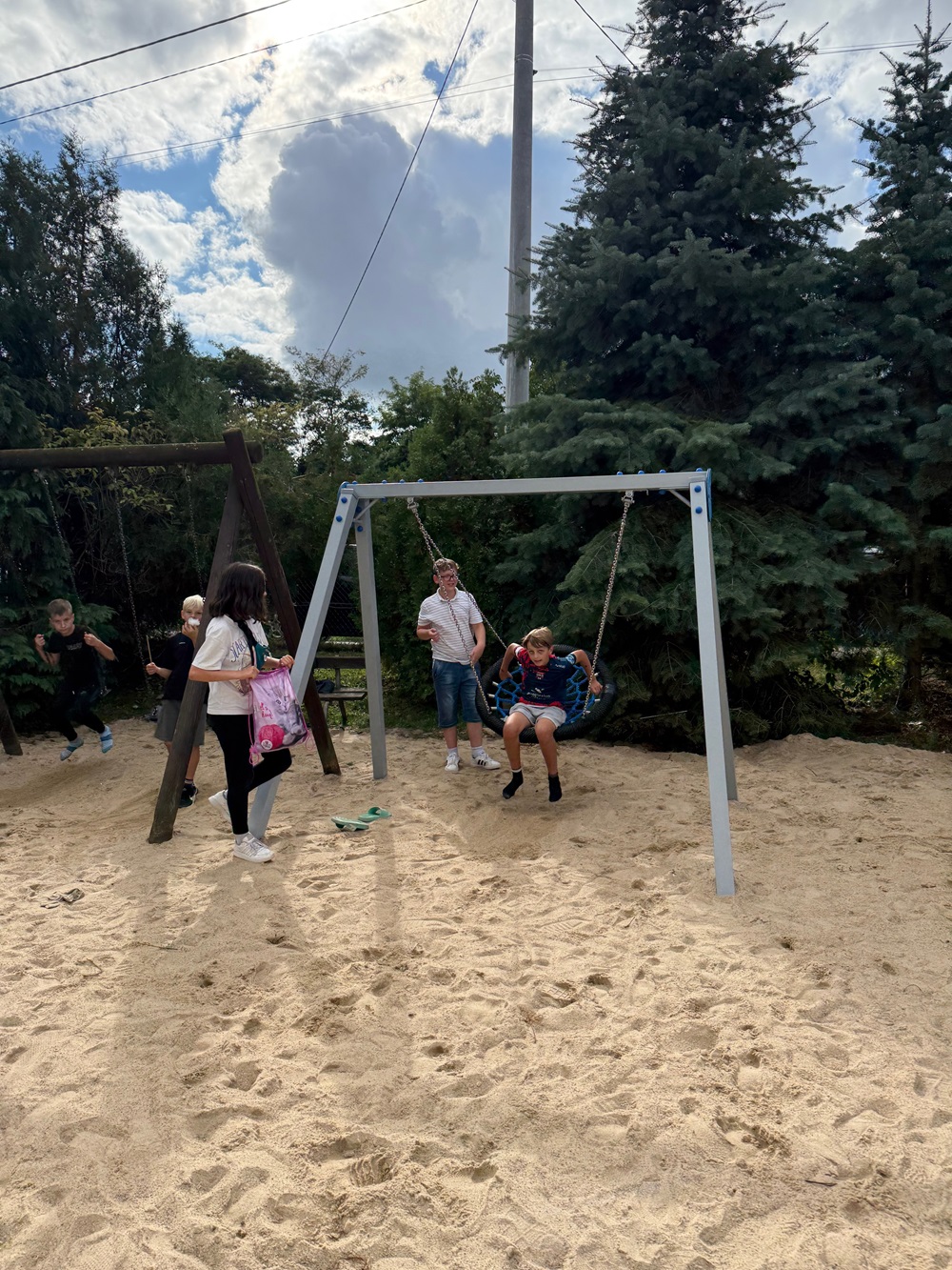 - Huśtawka typu ptasie gniazdo -konstrukcja wykonana z profili stalowych 8 x 8 cm, ocynkowanych, malowanych proszkowo, siedzisko o średnicy 100 cm lub 120 cm wykonane z liny tworzywa PP, łańcuchy wykonane ze stali nierdzewnej, śruby i nakrętki ocynkowane lub nierdzewne.
