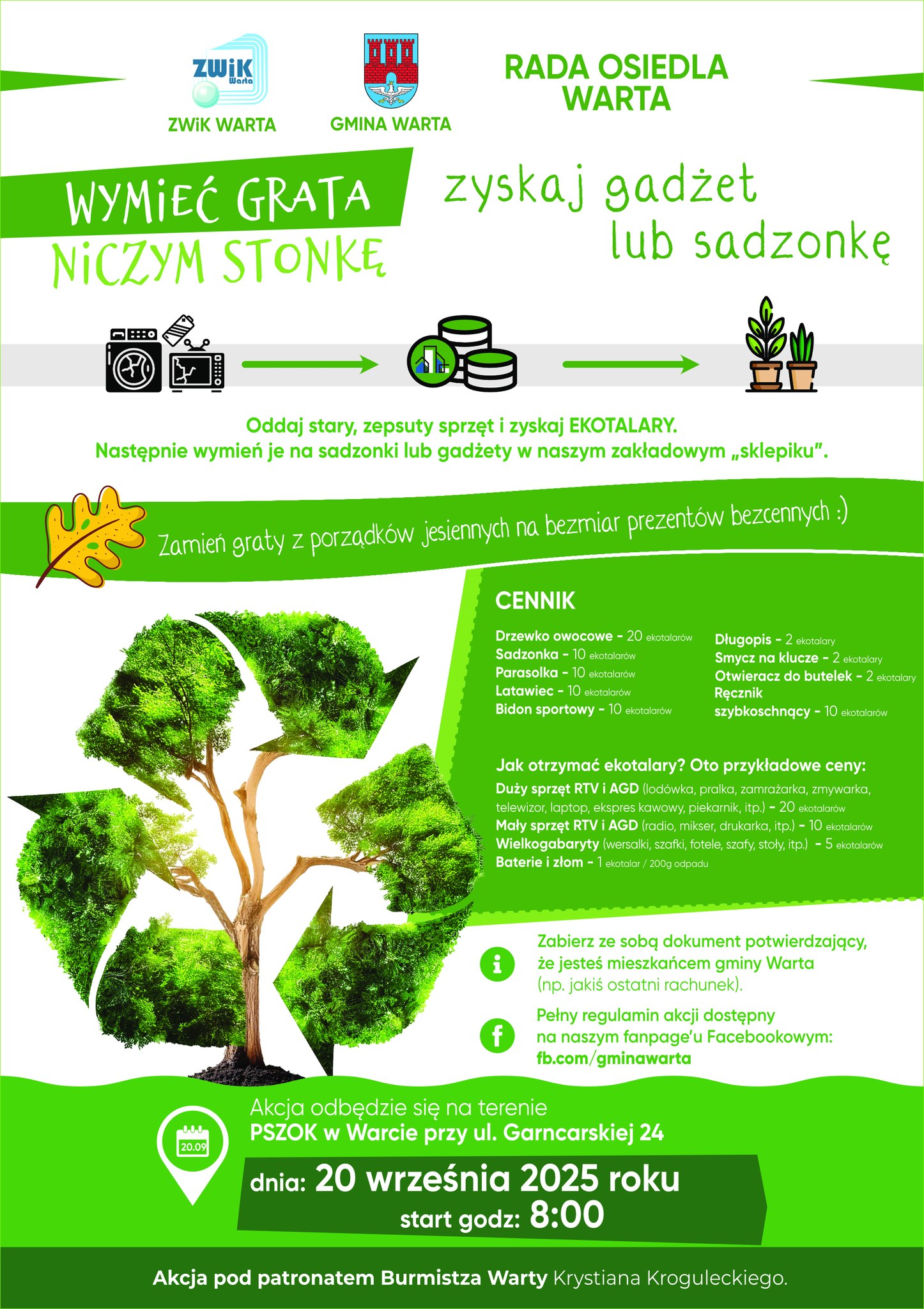 Na akcję należy zabrać ze sobą dokument potwierdzający, zamieszkanie na terenie Gminy Warta że jesteś (np. jakiś ostatni rachunek). Pełny regulamin akcji dostępny jest na fanpage’u Facebookowym: fb.com/gminawarta. Akcja odbędzie się na terenie PSZOK w Warcie przy ul. Garncarskiej. Akcja pod patronatem Burmistrza Warty Krystiana Kroguleckiego.