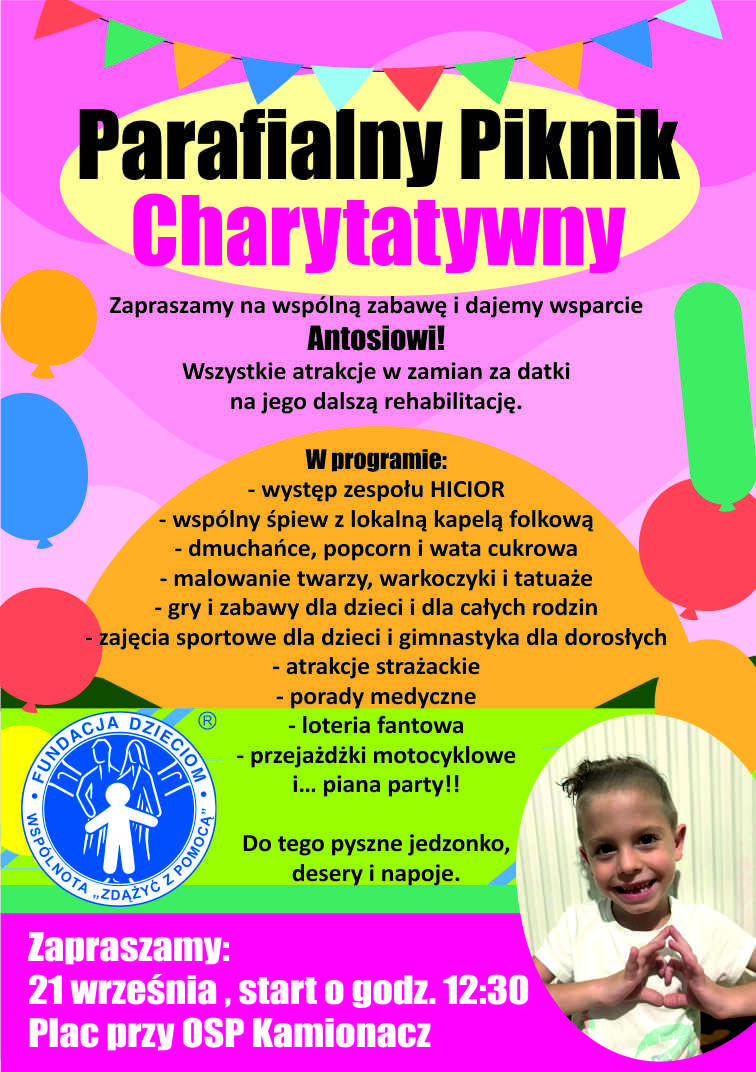 21 września na placu przy OSP w Kamionaczu odbędzie się Parafialny Piknik Charytatywny dla małego Antosia, który od urodzenia mierzy się z chorobą - wrodzoną wadą atrezji przełyku i niepełnosprawnością intelektualną w stopniu lekkim. Pieniądze zebrane podczas wydarzenia zostaną przekazane na rehabilitację Antosia.