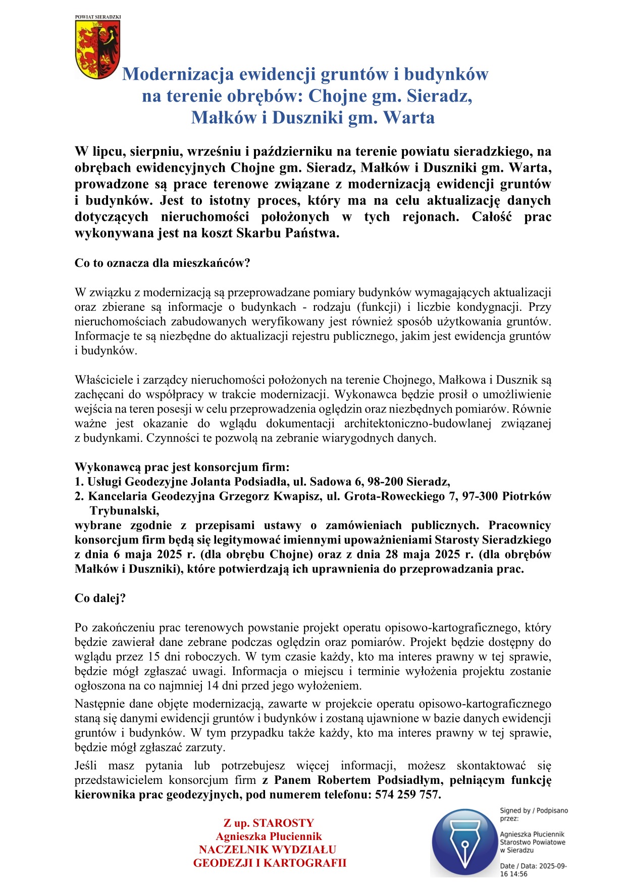 wybrane zgodnie z przepisami ustawy o zamówieniach publicznych. Pracownicy konsorcjum firm będą się legitymować imiennymi upoważnieniami Starosty Sieradzkiego z dnia 6 maja 2025 r. (dla obrębu Chojne) oraz z dnia 28 maja 2025 r. (dla obrębów Małków i Duszniki), które potwierdzają ich uprawnienia do przeprowadzania prac.