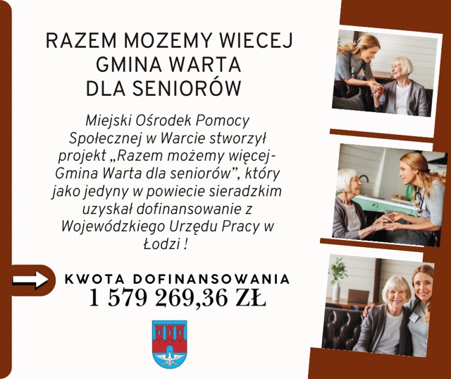 Gmina Warta jak zapewne większość jednostek samorządowych w Polsce boryka się deficytem form wsparcia dla seniorów. Ze względu na potrzebę zaopiekowania seniorów zrodziła się idea stworzenia projektu, który byłby odpowiedzią na zaistniałą sytuację. W ramach działania FELD.07.09 Usługi społeczne i zdrowotne Miejski Ośrodek Pomocy Społecznej w Warcie stworzył projekt "Razem możemy więcej - Gmina Warta dla seniorów".