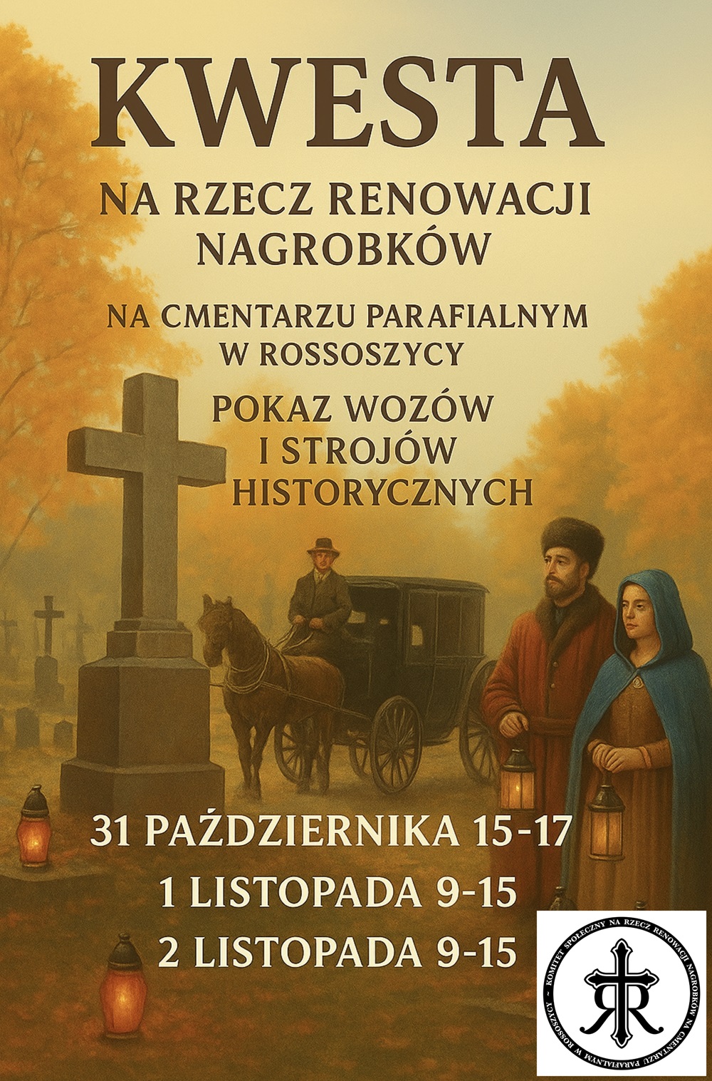 Kwesta będzie w formie zbiórki do puszek przeprowadzonej przez wolontariuszy na Cmentarzu Parafialnym w Rossoszycy. Celem tych działań jest pozyskanie środków na renowację historycznych nagrobków znajdujących się na cmentarzu w Rossoszycy. Zbiórka posiada numer identyfikacyjny 2025/2630/KS nadany przez Ministerstwo Spraw Wewnętrznych i Administracji. Jest przedsięwzięciem cyklicznym zgłoszonym i znajdującym się na Portalu Zbiórek Publicznych. Organizatorem jest założony w kwietniu 2024r., Komitet Społeczny na Rzecz Renowacji Nagrobków na Cmentarzu Parafialnym w Rossoszycy z siedzibą w Rossoszycy ul. Warcka 8 budynek OSP. Zgodnie z założeniami ww. komitetu zebrane środki pieniężne zostaną przeznaczone na renowację starych i zaniedbanych pomników osób znanych i zasłużonych dla parafii.